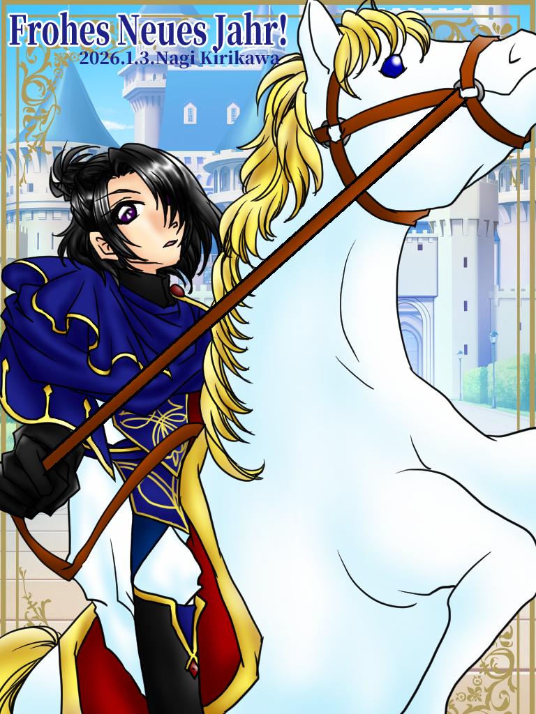 2026年の新年絵です。午年だからティレルさまに白馬の王子様になっていただきました。昨年のボルフェスのキービジュアル衣装です。描いててこのマントどういう作りになってるんだ…?と思ったので今度レイヤーさんの衣装を見せていただきたい。馬は3D素材を使って描きました。何でもあるな3D素材。