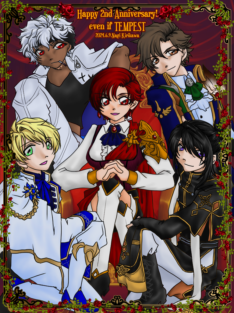 テンペスト魔女2周年おめでとうイラストです。ナスチャとメイン攻略対象4人を描こうとは思っていたのですが、SNS投稿前提なので縦レイアウトで、4人が全部描ける絵…ということで、椅子に座っている女神の周りにかしずく4人みたいなのにしようかなと!椅子付きの背景素材を探して、それを基準に描いていきました。椅子は全然見えなくなってしまいましたがw主に後ろの二人のせいですね…w