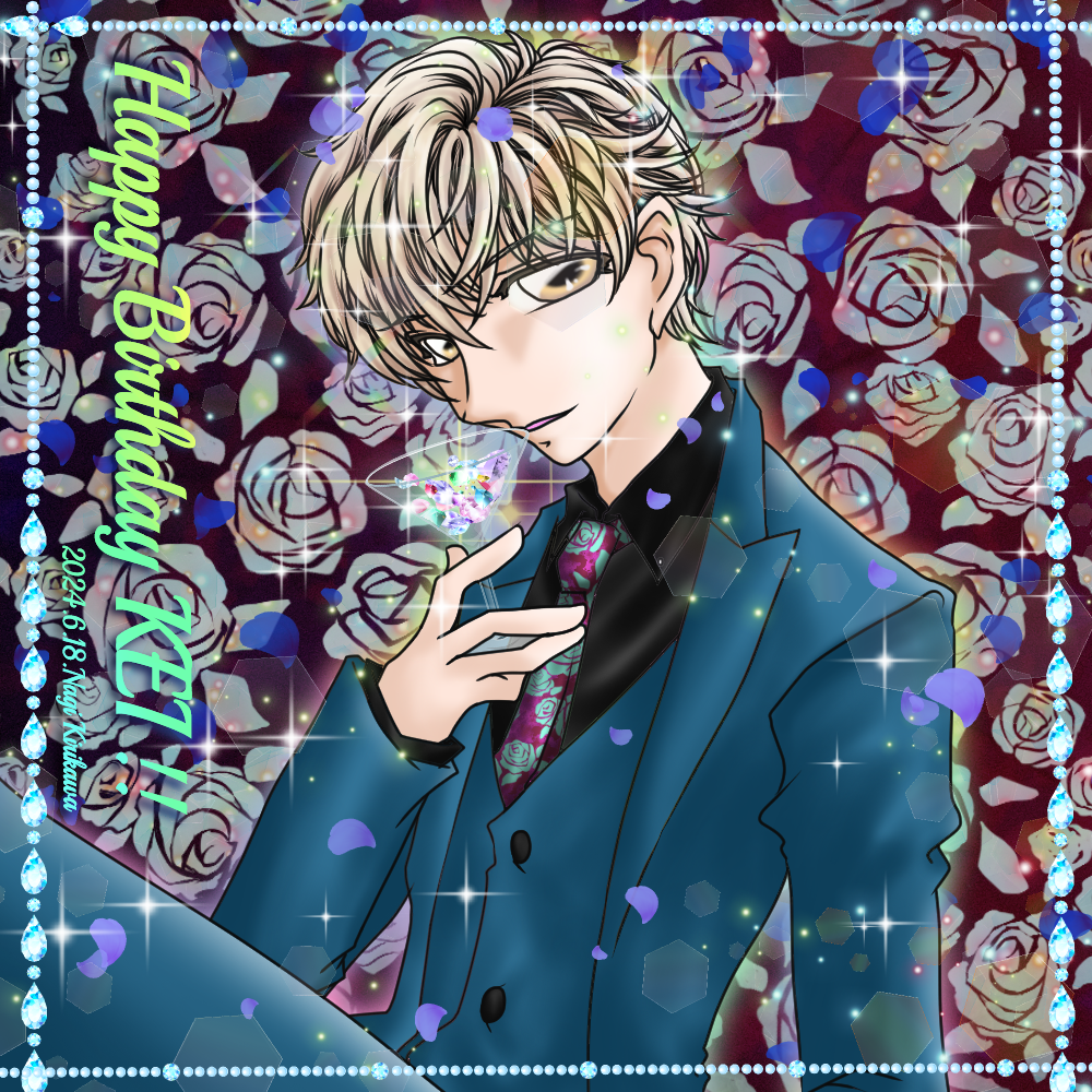 「マスカレード・キス」の添島2024年バースデー絵です。去年よりちょっとだけ添島っぽくなった気がします…w去年が本当にアレだったので今年のバースデーイベントは平和で幸せそうで良かった…w 宝石カクテルがとても素敵だったので、宝石モチーフにキラキラさせてみました。スーツはバースデーイベント特典イラストのスーツです。バラ模様はもうちょっといいのがありそうな気もする…w改めて見ると背景もうちょっと抑え気味でも良かったなあ。ちょっとくどい感じも…まあこの毒々しさが添島って感じもするしいいか(*´‐`)