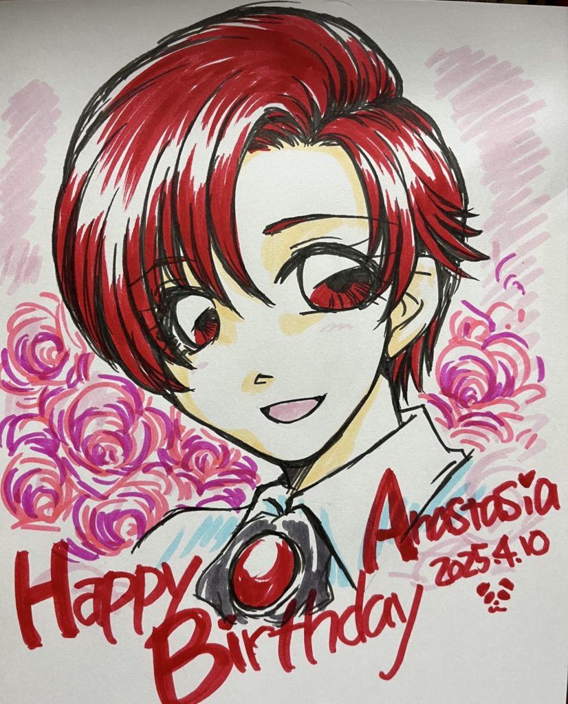 アナスタシアバースデー暫定 4月10日にアナスタシアバースデーイラストを描いてる最中に突然PCが死んだので、暫定でアナログで描いたものです。しくしく…しくしく…ひとまず可愛くかけたので良かった…しくしく。 もどる
